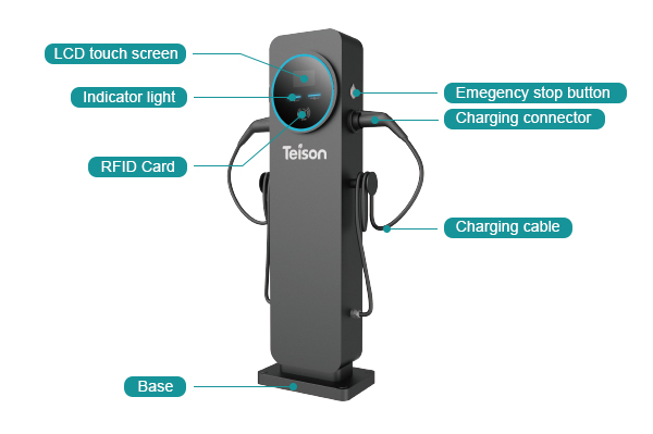 Floor Dual EV töltő egy háromfázisú kettős pisztoly / Socket AC töltőállomás, tele funkciókkal és ideális háztartási és kereskedelmi használatra.
